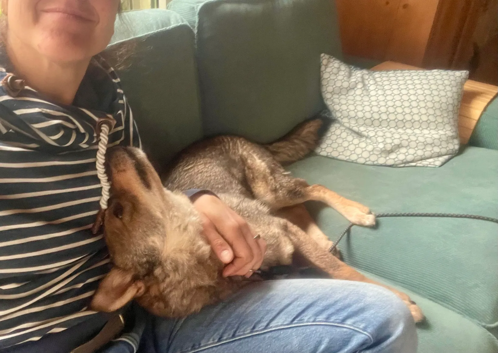 Im Haus ist Tripp ein ruhiger Hund. Er ist gerne bei seinen Bezugspersonen und ist zufrieden, wenn er einfach bei seinem Menschen in der Nähe liegen kann. Im Home Office liegt er gerne neben mir auf dem Teppich. Nachts schläft er ruhig neben unserem Bett.
