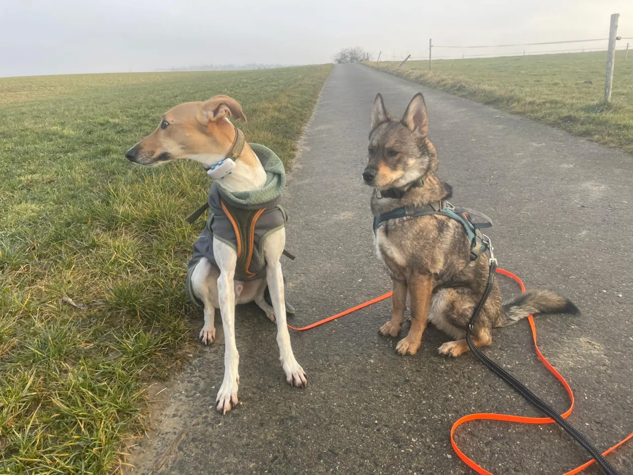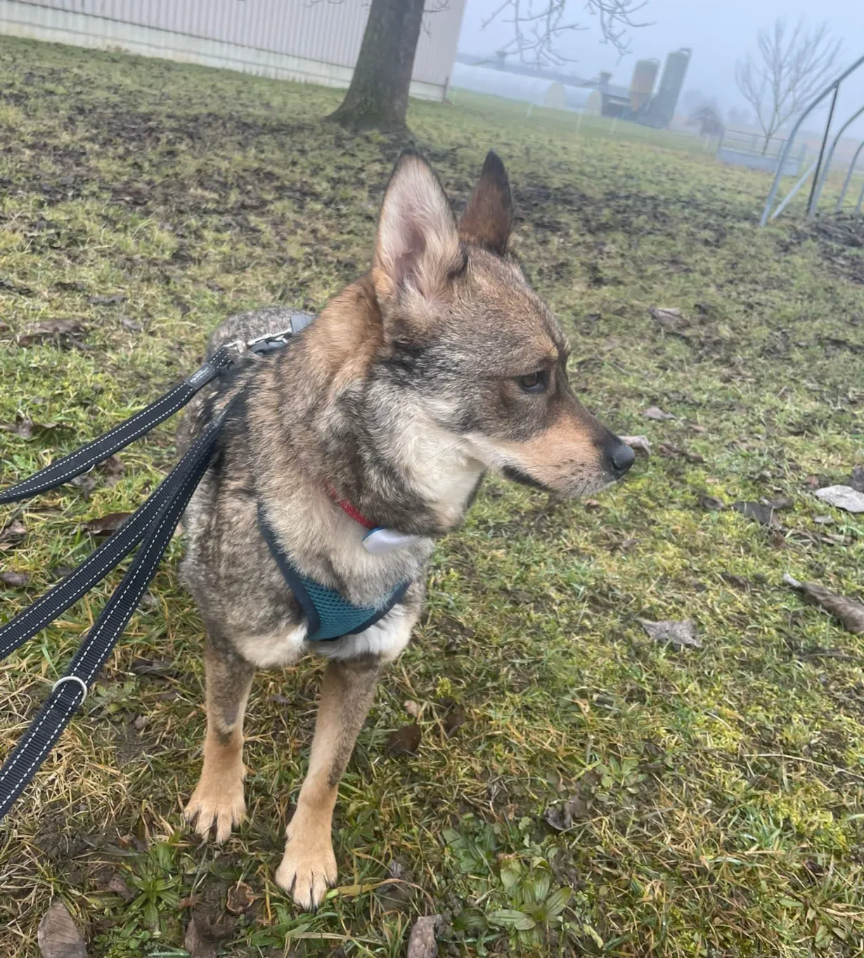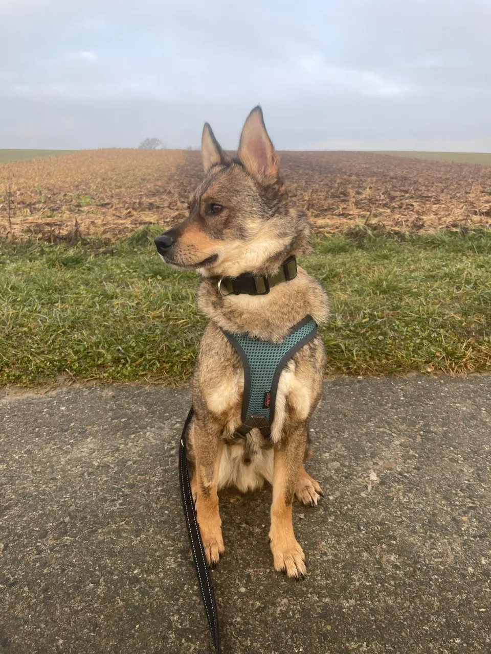 Tripp liebt Spaziergänge und geht bereits gut an der Leine. Auch Strassenverkehr ist kein Problem. Hundebegegnungen an der Leine müssen noch trainiert werden.